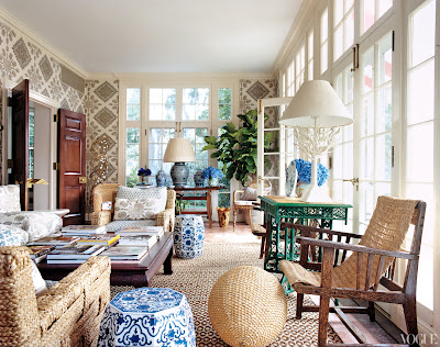 Yesterday, a friend mentioned noticing via Google how many posts I've written on Tory Burch. I only write about people worth writing about especially when they create aesthetically pleasing products and/or interiors. Both is true of Tory Burch and I love that her homes and stores inspire many with their great use of color and pattern. Her new Southampton home designed with help from architect and designer Daniel Romualdez and decorator Eve Hood has just been featured in Vogue. It's so chic that how could I not add another Tory Burch post to the pile. Even though it's in the summer enclave of The Hamptons, Ms Hood says, "nothing says ‘seashore’—she didn’t want a summerhouse but instead one that felt right at Thanksgiving and Christmas, a house that she could come to every weekend.” Judging from the photos, it looks like accomplished that and a whole lot more. See why Tory gets so many posts.